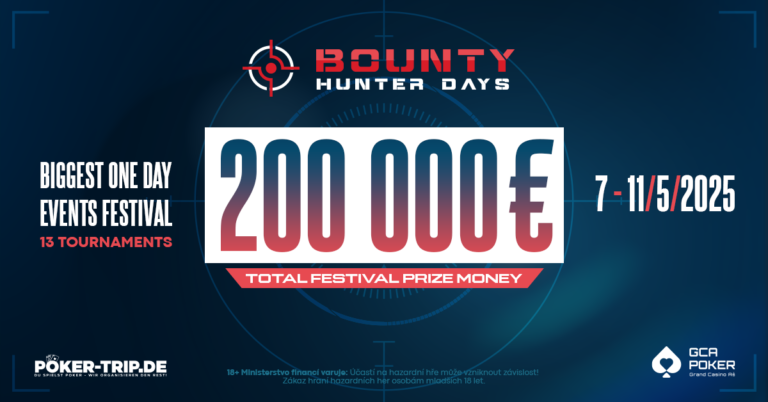Schon zum dritten Mal dieses kommt poker-trip.de mit den Bounty Hunter Days ins GCA, erstmals aber gibt es den neuen Pokerfloor. € 200.000 Preisgeldgarantie klingt dafür eigentlich gar nicht so viel, aber es gibt kein Multi-Flight Turnier. Es gibt nur One Day Tournaments und davon gleich einen ganze Menge. Das Main Event ist ein € 150 + 50 +30 PKO mit € 50.000 GTD.